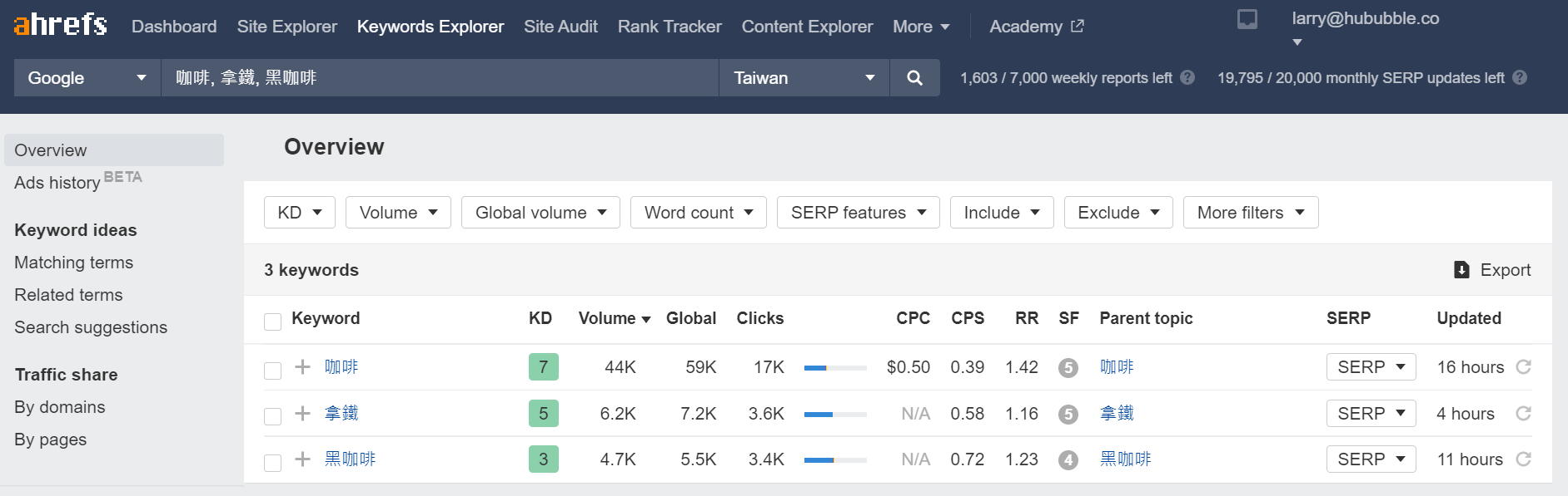 簡單分享操作邏輯 :將你腦力激盪後想到的主題放入關鍵字研究工具(如 : Ahrefs Keywords Explorer, Google Keyword Planner, MOZ, SEMrush 等)中,查看相關的關鍵字,並將任何你覺得有用的內容主題 ( 以咖啡為例 )添加到你的關鍵字列表中。