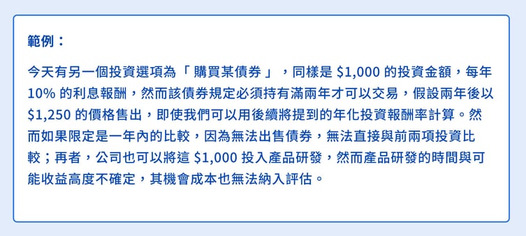 如應用重點中所述,ROI 的計算是不考慮時間的,如果一項五年期的投資報酬率為 20%,而另一項投資兩年期為 15%,那究竟哪一項投資比較好呢?